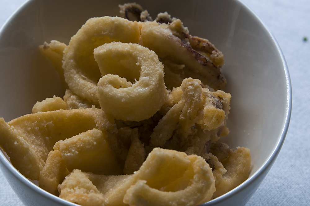 Chipirones plancha con oreja crujiente; alitas maceradas en salsa Hoisin; Albóndigas de ternera en salsa de boletus