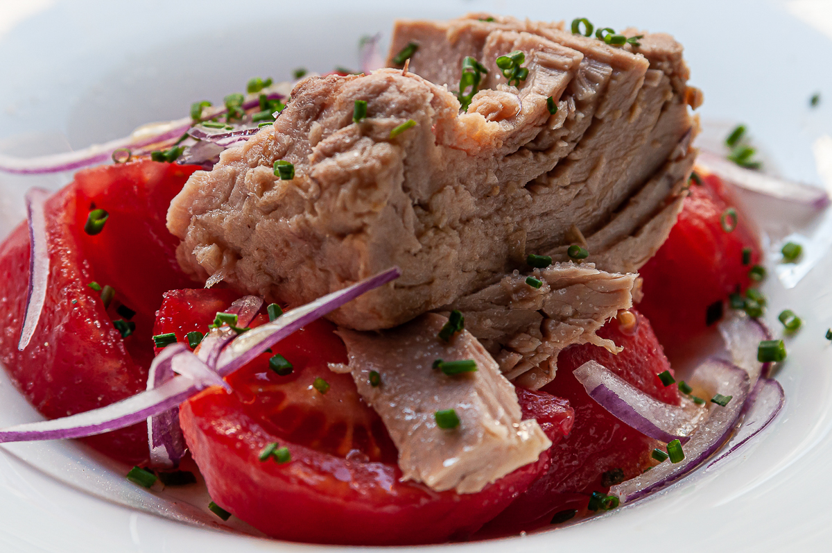 Lechuga, pimiento rojo asado, cebolla confitada, huevo cocido, bonito y mayonesa