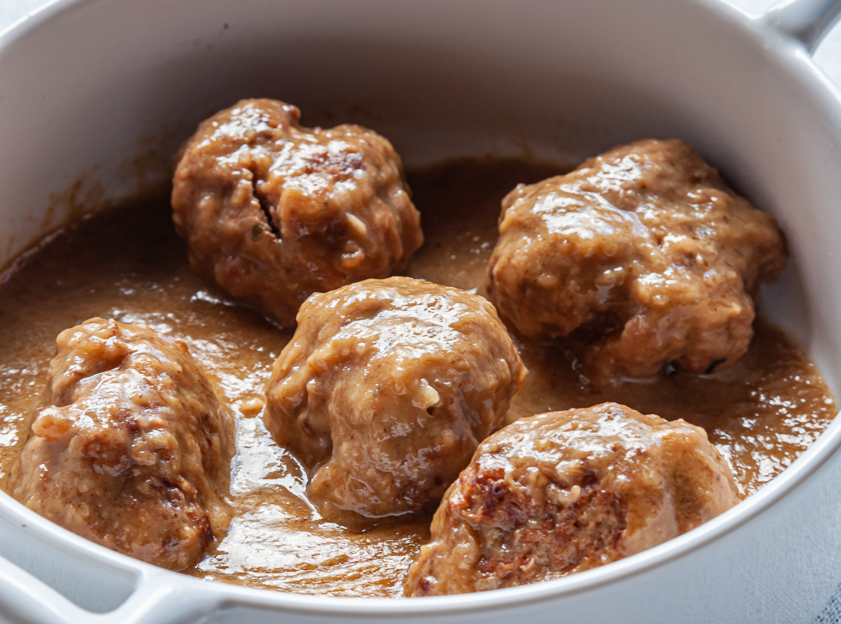 Hecho con carne de pato, cerdo y ternera. Acompañado con costas de pan y encurtidos